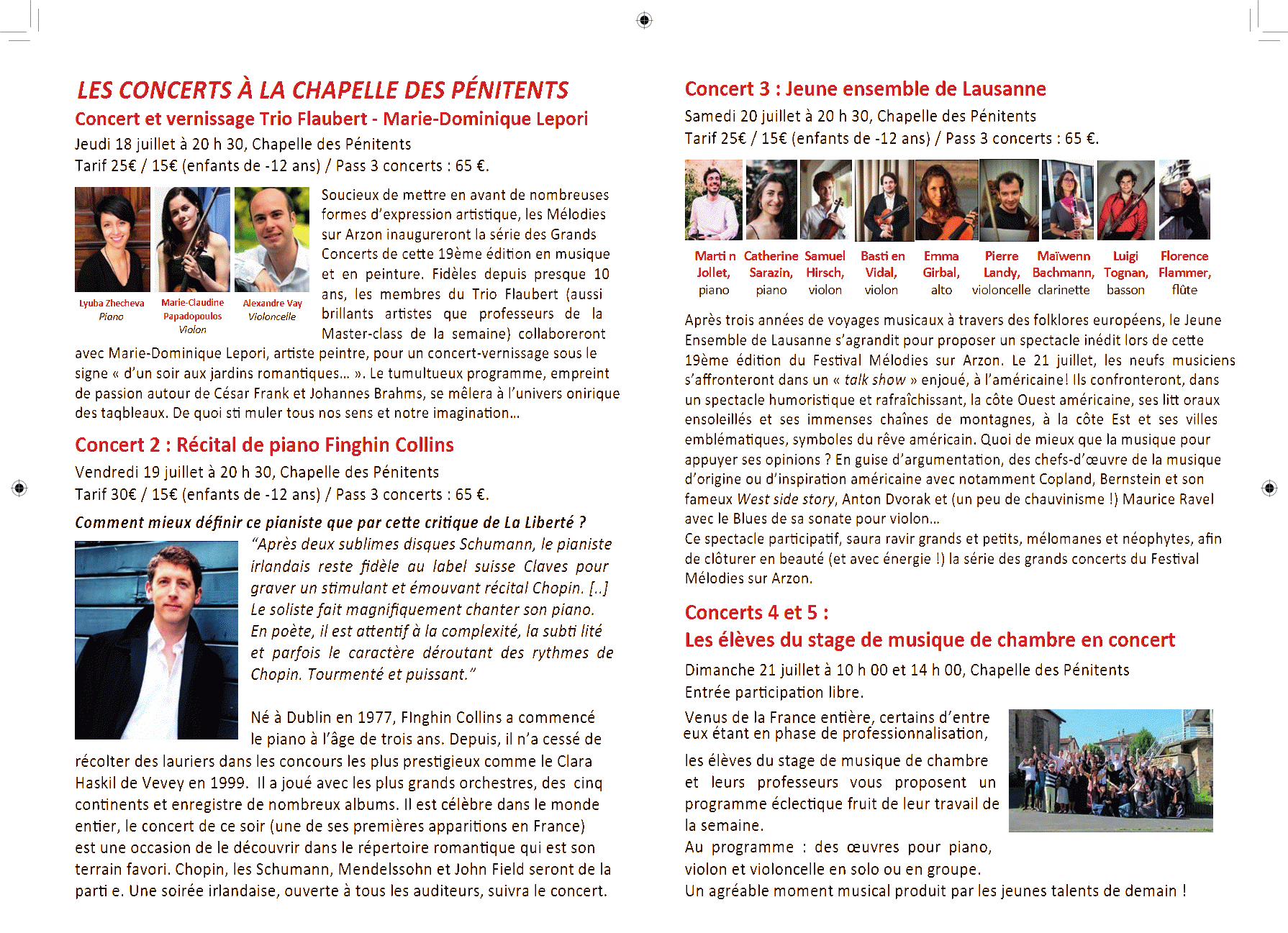 * deux concerts le dimanche, en clôture du festival, réalisés par les élèves de la master class et ouverts au public.